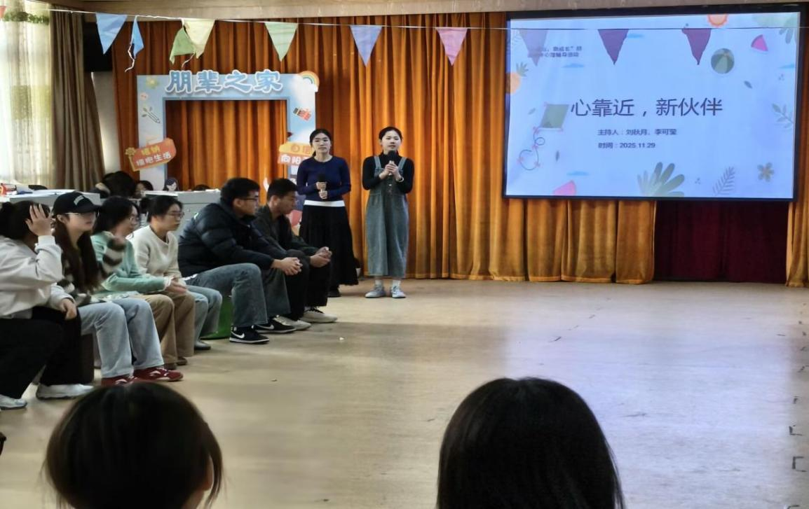 2025年11月29日-30日,我校“一站式”学生社团开展“心适应,新成长”朋辈团体心理辅导系列活动之“心靠近,新伙伴”。本次活动由教师教育学院小语23班的刘秋月和马克思主义学院思政244班的李可莹同学共同主持,吸引了一百余名同学踊跃参与。