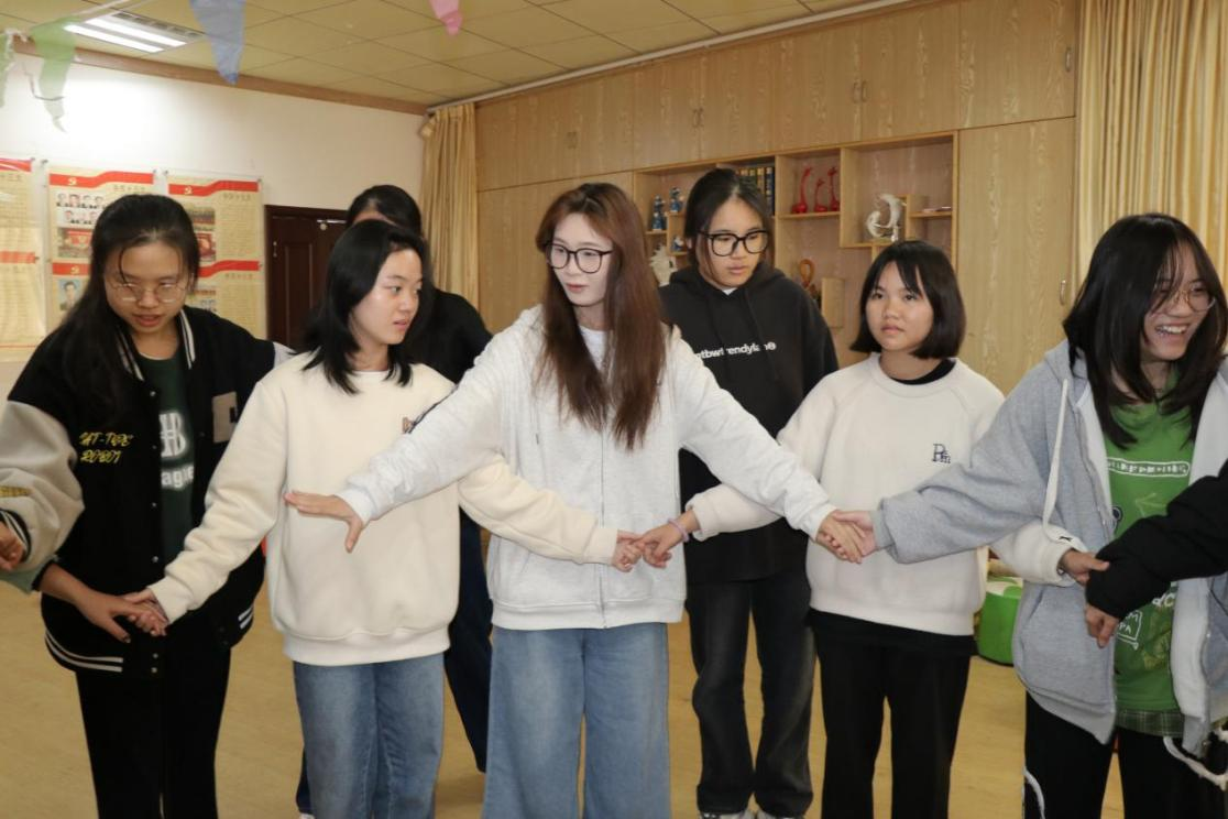 活动现场,趣味十足的“数字抱团”热身环节率先点燃氛围。同学们根据主持人喊出的人数快速组队抱团,欢声笑语中打破了陌生感,现场热情持续高涨。随后的“情系千千结”活动中,同学们分组手牵手围成圆圈,面向圆心通过跨、钻、套、转等方式合力解开“结”。大家在肢体互动中密切配合,在协作解结中学会倾听与信任,深刻体会到团队协作的力量。